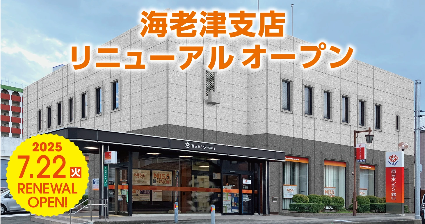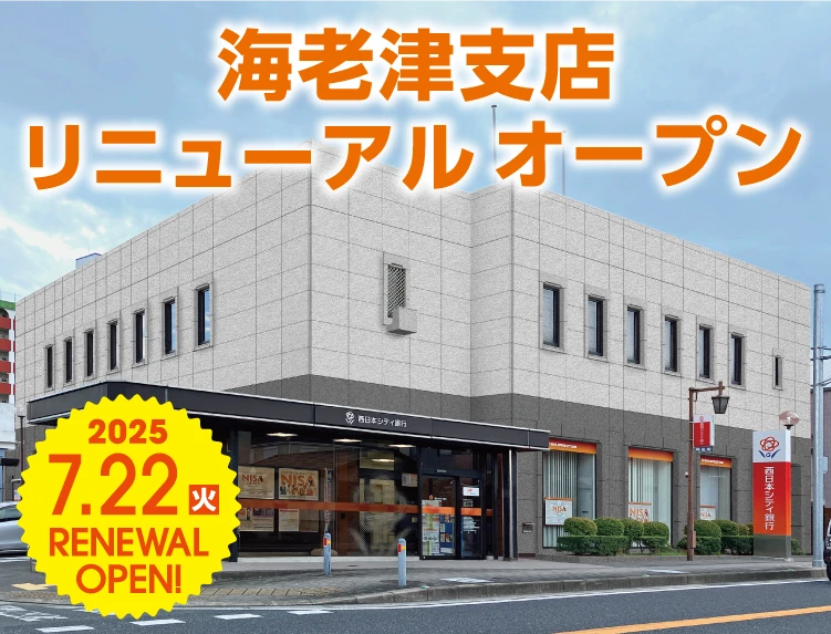 2025年7月22日(火)に海老津支店がリニューアルオープンしました。リニューアルオープンを記念し、当店店頭限定のキャンペーンを実施中です。ぜひ海老津支店へご来店ください。