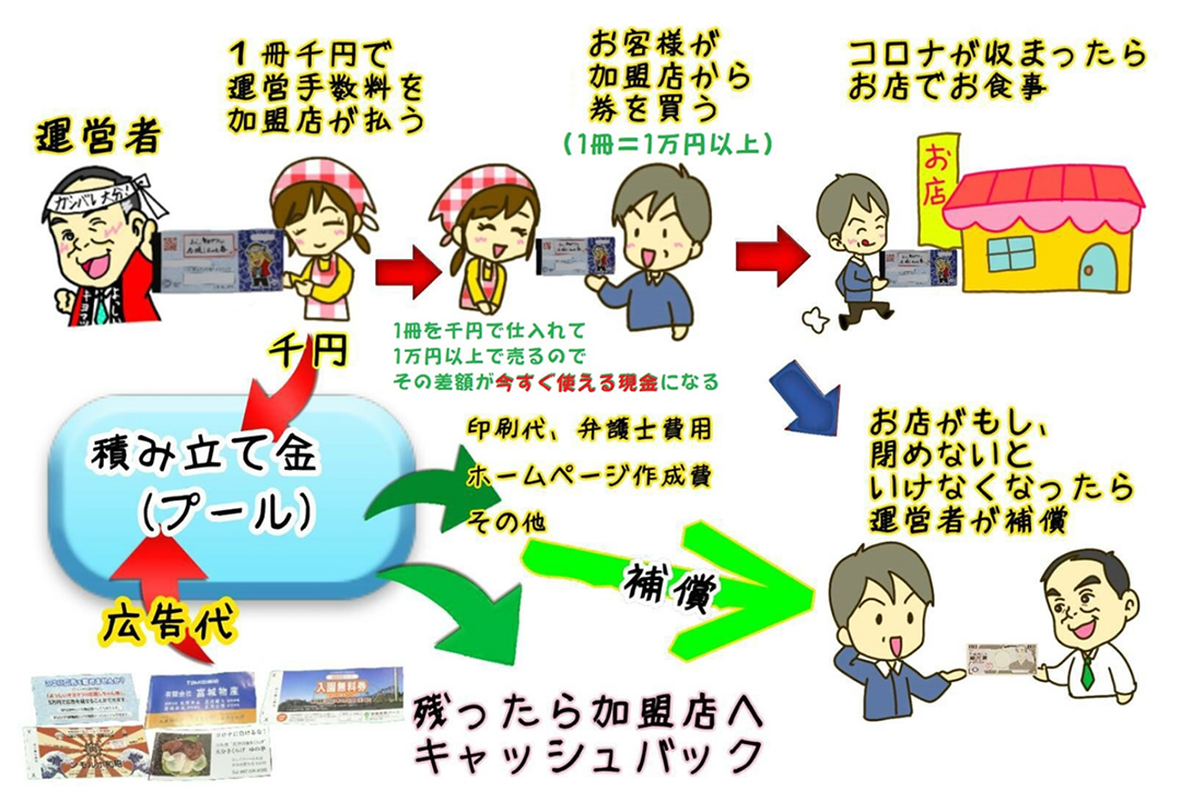 『世のため』の商品券とは? 『よっしぃキヨマツの応援しちゃん券』と名付けられた商品券。仕組みはこうだ。① 加盟店が1冊1,000円で商品券を購入 ② 加盟店は1冊10,000円以上でお客さまに販売し、差額を当座の運転資金に充てる ③ お客さまは、その商品券で後日“行けるようになったら”加盟店を利用する ④ 加盟店が支払った1,000円をプールし、商品券の印刷代などの事務局運営費に充てる。事務局運営費には趣意に賛同してくれる企業からの広告費も充てる という持続可能な仕組みである。コロナ禍で休業や時短営業を強いられている加盟店は、運転資金を確保しつつ、ロイヤルカスタマーを囲い込むことができる。