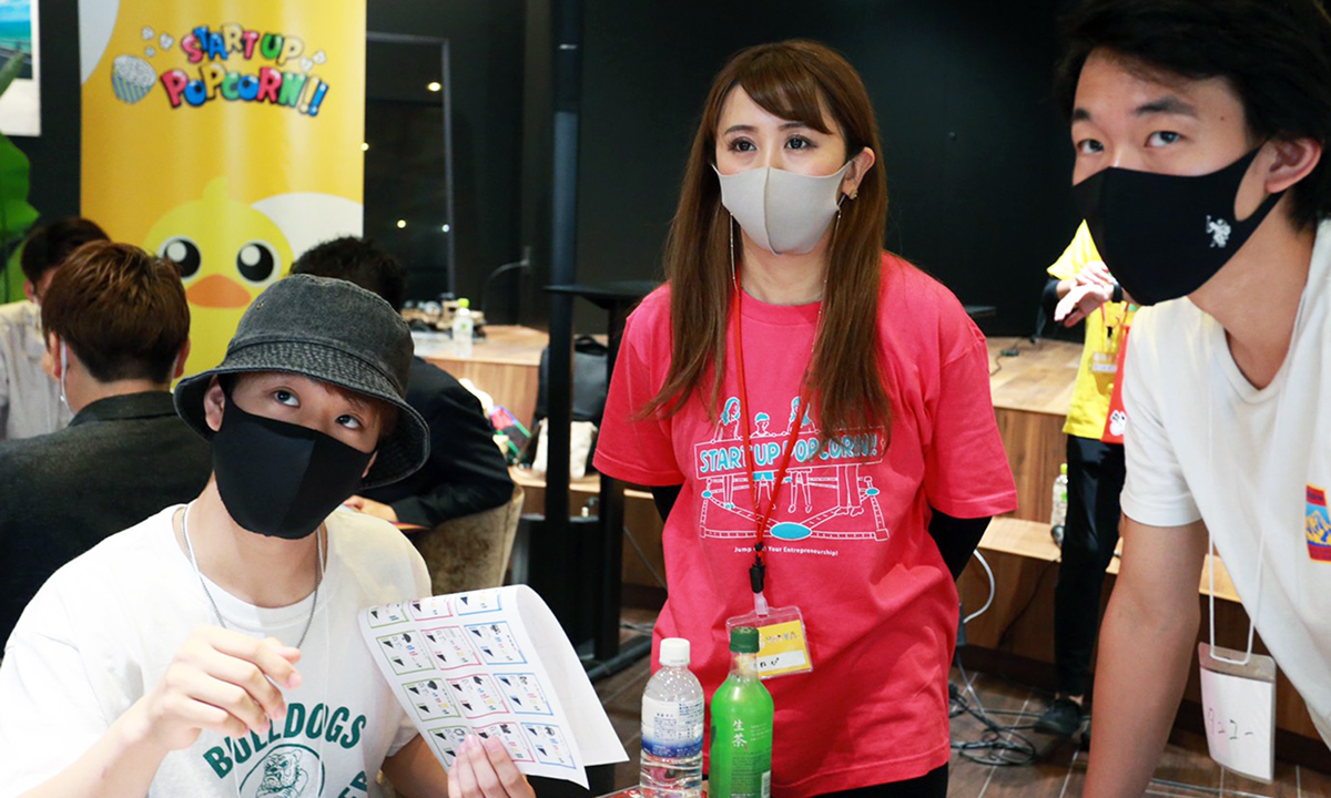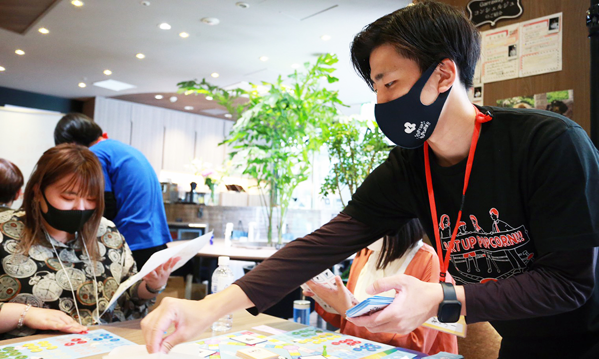 飯塚市には「つなぐカフェ@飯塚」という交流スペースがある。地域の企業関係者や学生をはじめとした市民同士の交流を促し、新たなつながりを得るための施設で、2018年から運用が開始された。飯塚市、飯塚市に拠点を持つ企業、地域住民に加え、飯塚地区の三大学 (九州工業大学、近畿大学、近畿大学九州短期大学) の学生たちがさまざまに利用している。特に、飯塚地区の大学生にとっては、学外の人たちと交流を深めることで、新しい視点や価値観から自分たちの考え方や技術を見直すことができると好評だ。「『つなぐカフェ@飯塚』では、学生たちに地元企業の会社紹介ではなく職業紹介をするというプログラムが定期的に開催されていて、僕も“飯塚市で若くして起業した経営者”としてたびたび参加していたんです。そうすると、大学生の中でも、働く意思の高い人が僕の周りに集まってきて、中には起業したいと考える学生が数人いて、いろいろな相談を受けたりしていました。その中から、大学1年生と2年生のコが、2人起業したんですね。僕から見ても『このコたちはきっと、将来成功するだろうな』と思える2人で、『これ、もっとたくさんの人、もっと言えば、子どもたちに共有できないかなぁ』って思ったのがSTAPO!! の始まりです。その2人に『子どもたち向けに“起業家教育”を、ゲーム形式でやってみない? 』って声をかけたんです」と振り返る澤田さん。STAPO!! のプログラムの強みは、現役バリバリの起業家たちや、スタートアップの当事者たちが、その経験や知識、思想を持ち寄って、今の時代の求めに的確に答えられるよう設計されている点にある。