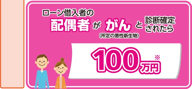 | (8)がん診断給付金(配偶者型)(100万円) | 住宅ローン借入者の配偶者が、責任開始日からその日を含めて90日(免責期間)経過後の保険期間中にがん(所定の悪性新生物)に罹患したと医師によって病理組織学的所見(生検)により診断確定されたとき※お支払いは1回のみ | |